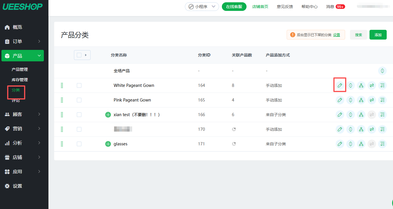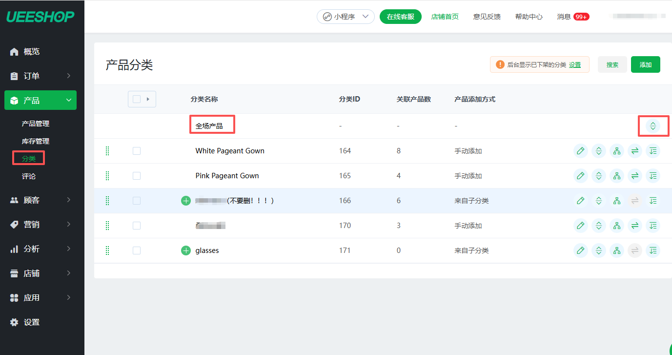 (1)登录网站后台,左侧工具栏进入产品--分类,点击全场产品右侧的修改按钮,可以对总产品列表页的产品进行排序,即页面 https://xxx.com/products/