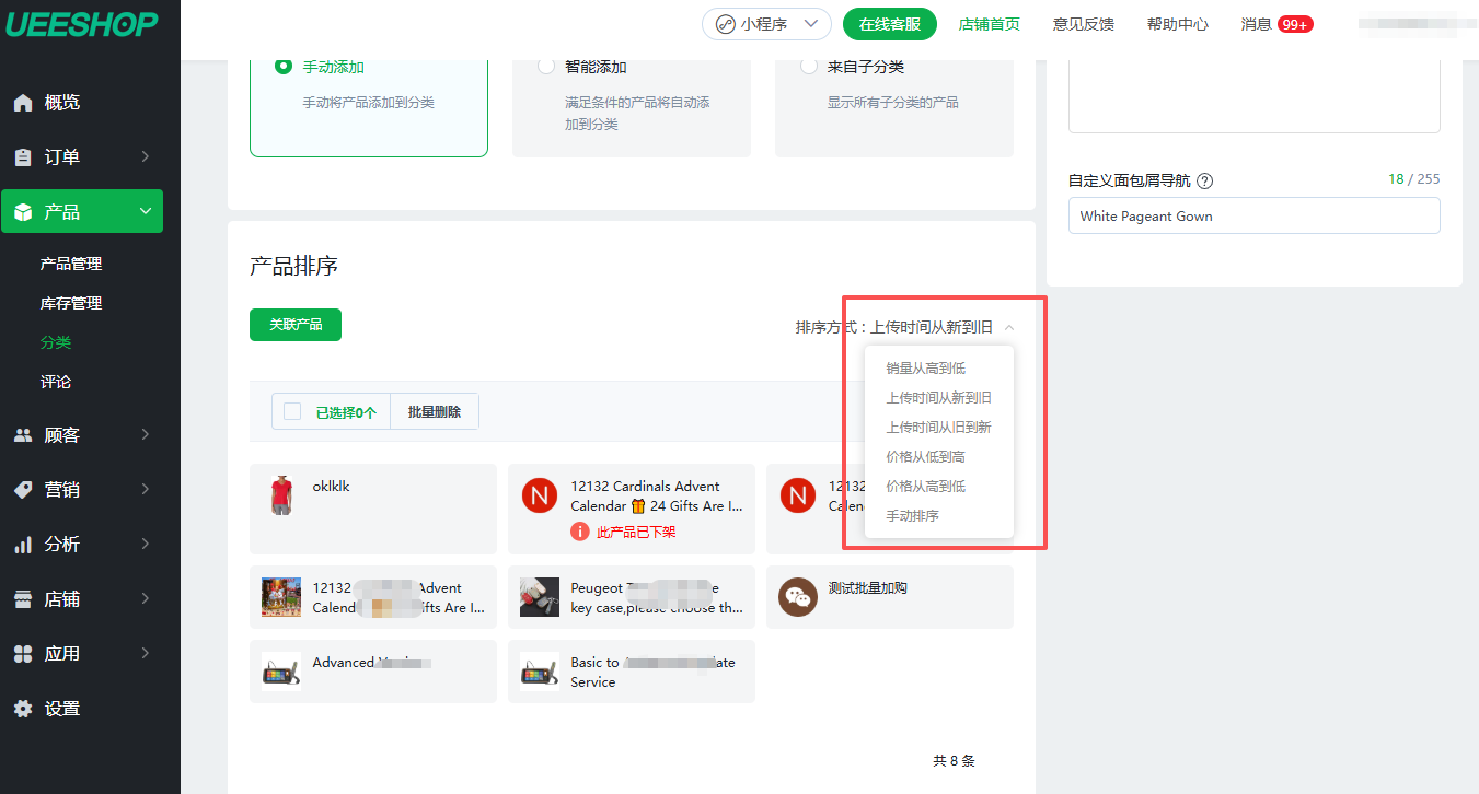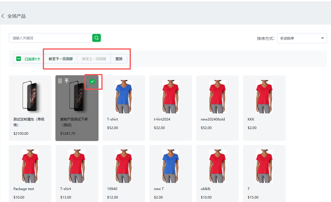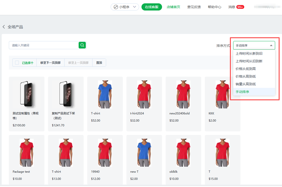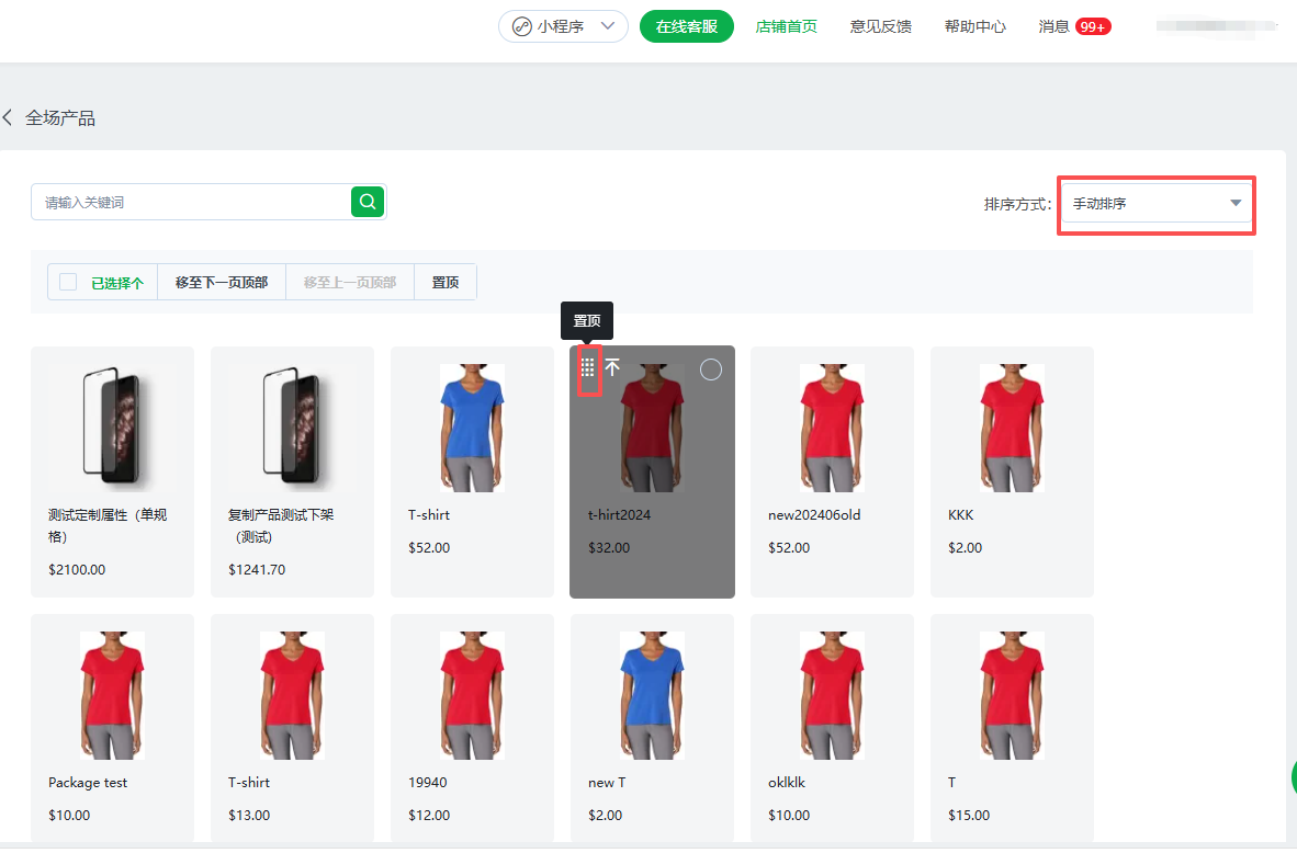 (3)如果选择手动排序的方式,光标移动到具体产品,点击拖动,可以拖动产品进行排序