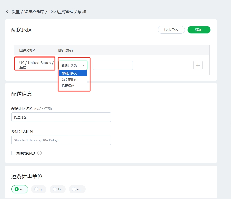 (12)例子中,针对勾选的国家,美国,可以选择对应识别邮政编码的方式,分别是邮编开头,邮编数字范围,或者指定编码