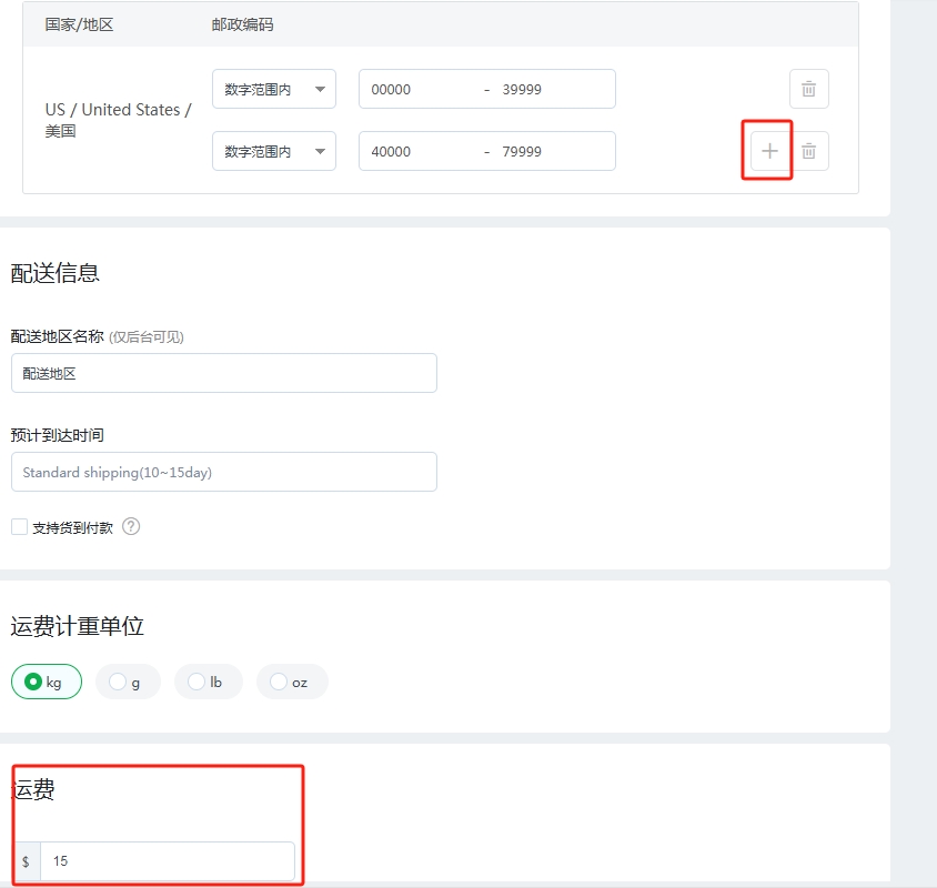 (14)如果是设置不同邮政编码,设置同样的固定运费的话,在邮政编码旁边点击添加按钮,可以添加不同的邮政编码范围