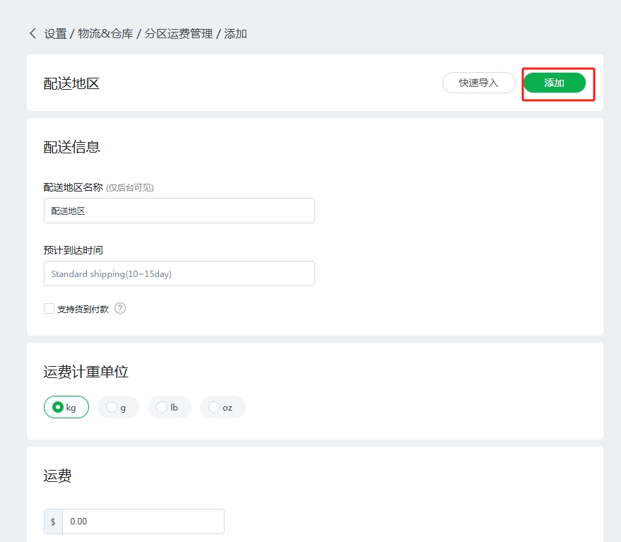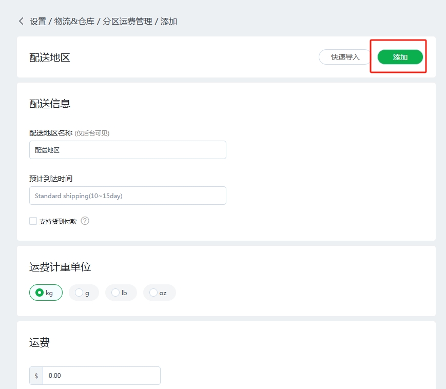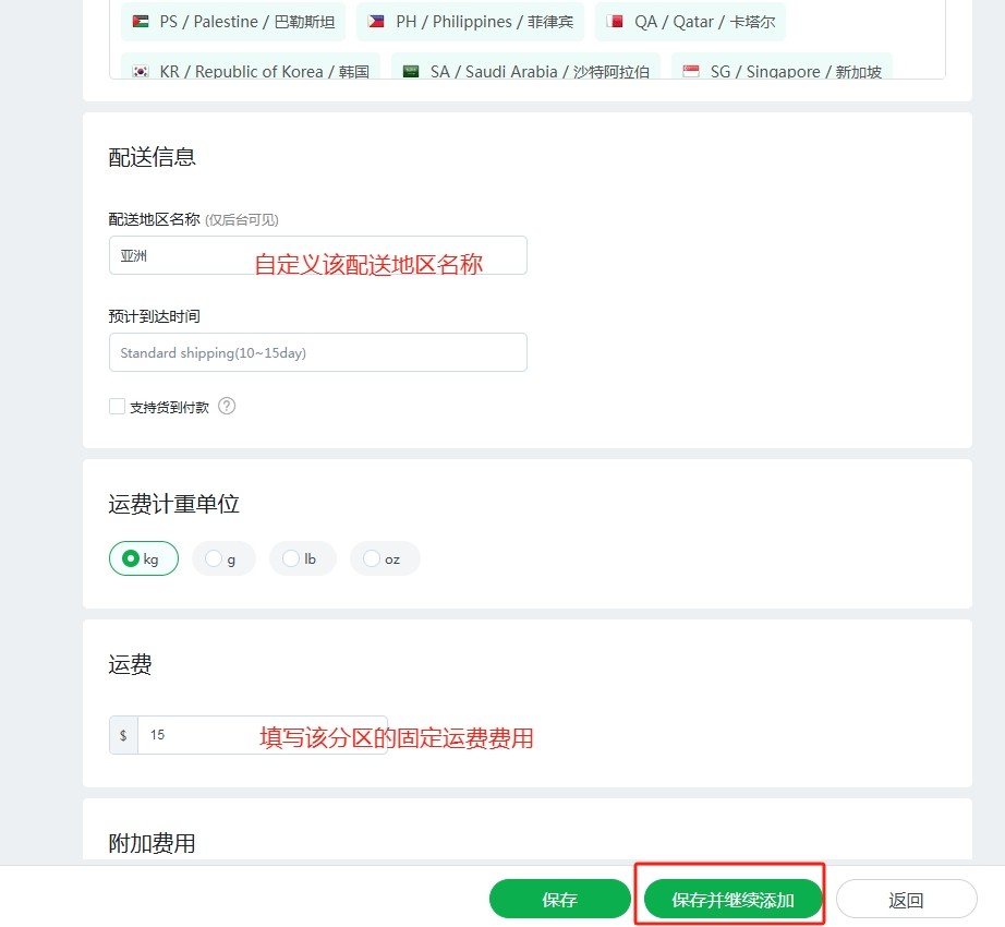填写该配送地区的运费后,如需增加其他配送地区,则点击“保存并继续添加”,设置其他配送地区运费,如不需增加,则点击“保存”