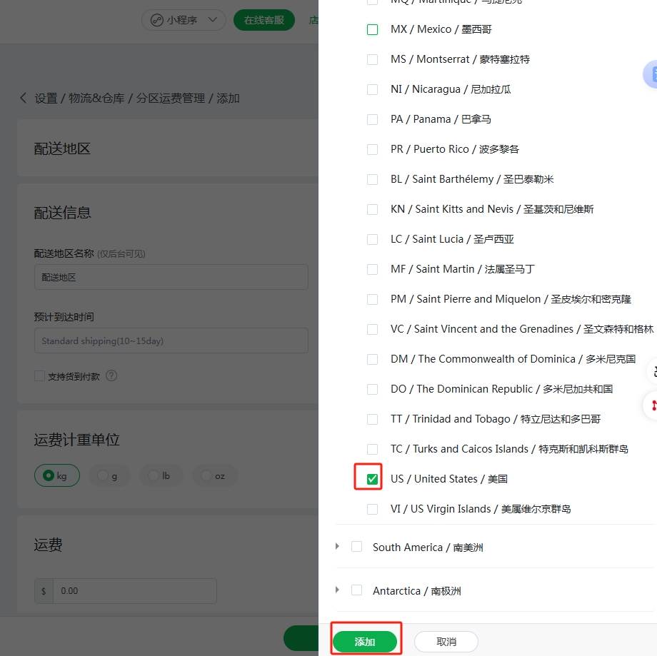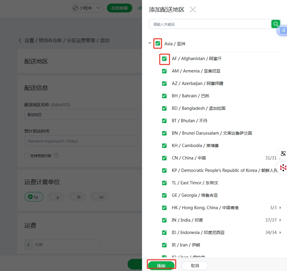 (6)配送地区点击“添加”,勾选适用该配送地区运费的国家