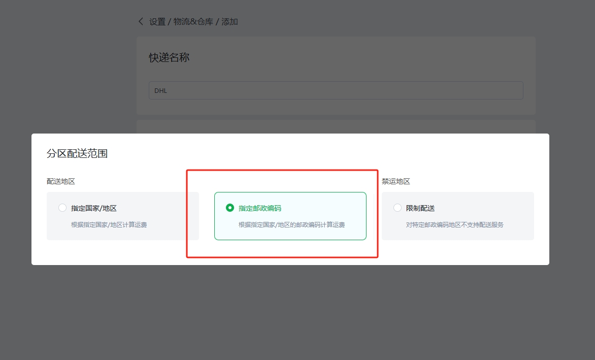 (4)选择该分区使用的配送范围,可选择根据具体国家计算运费,或者是根据指定的邮政编码计算运费,也可以选择指定邮政编码不支持配送服务