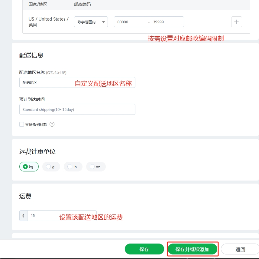 如果需要设置,不同邮政编码范围,不同运费的,则继续点击“保存并继续添加”,去添加不同配送分区及运费