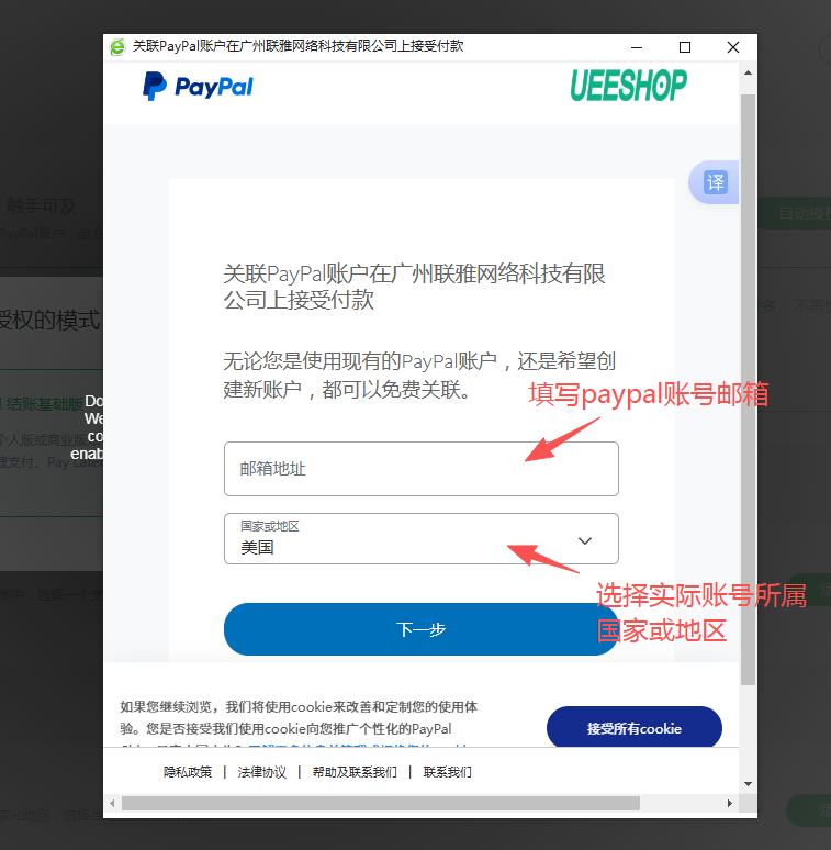3.填写paypal账号,选择美国,点击下一步完成授权