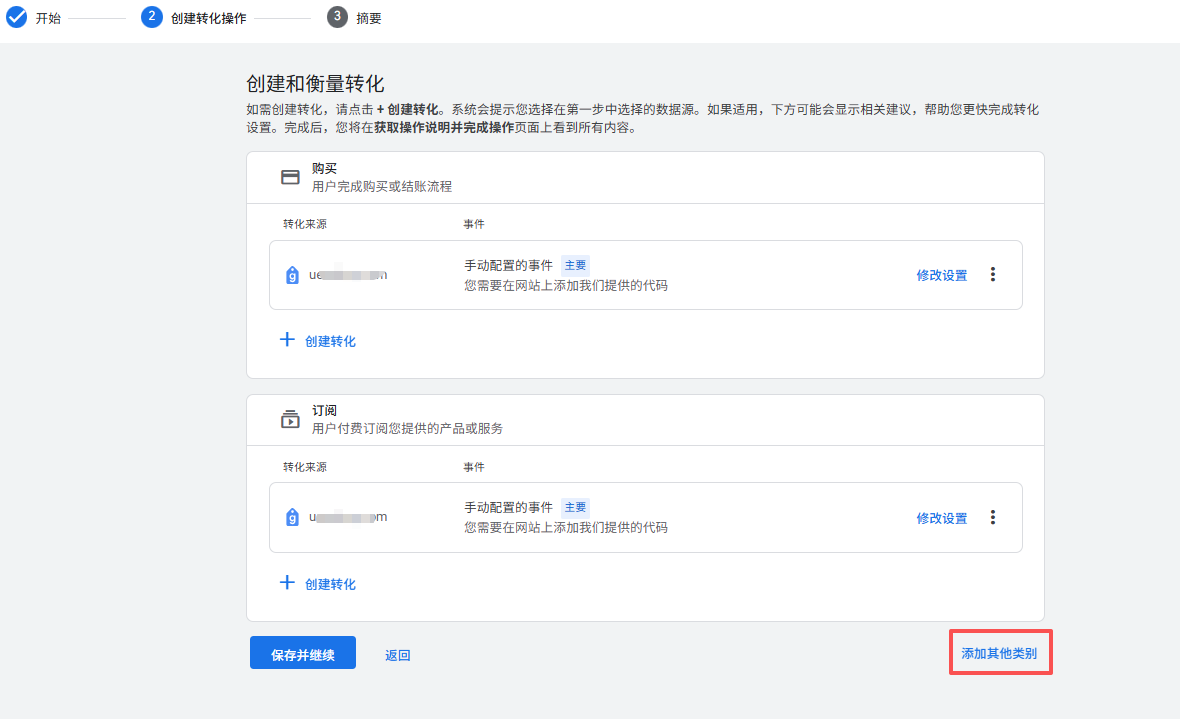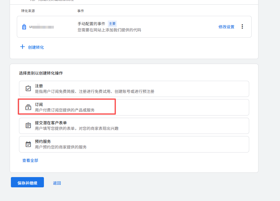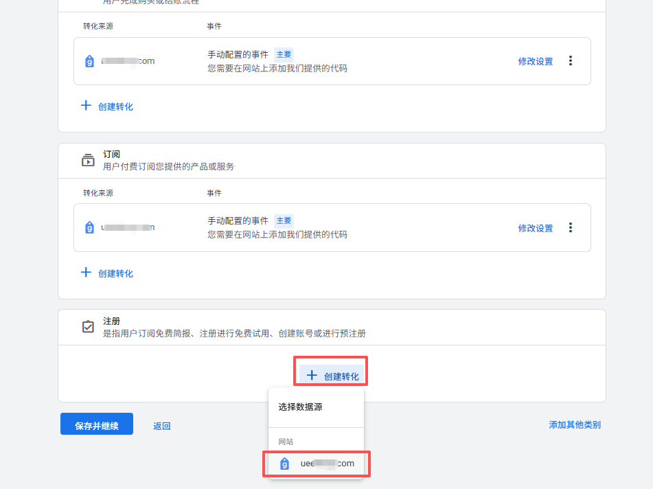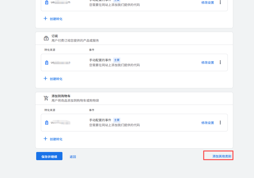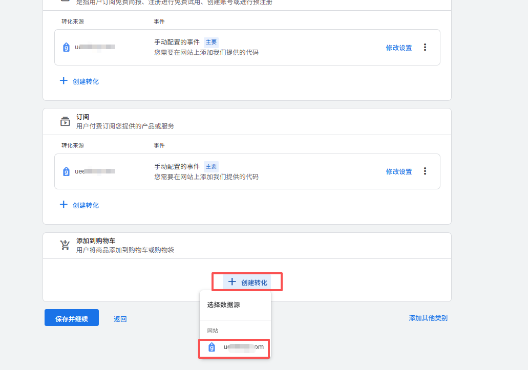 注意:红框内的3个转化目标(注册、订阅、添加购物车),点击查看时间代码后,选择的类型是“点击”类型,再进行代码的复制