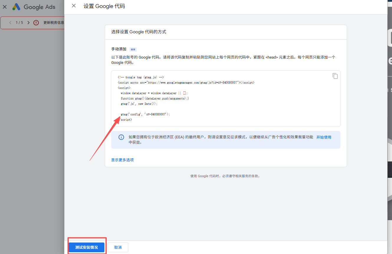 把复制的代码粘贴进去,默认选择head的位置,点击保存,然后返回到谷歌的页面,点击测试安装情况