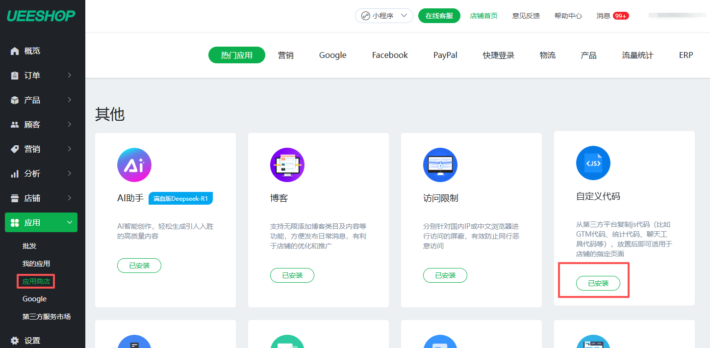 (34)登录后台,应用商店,找到自定义代码进入添加