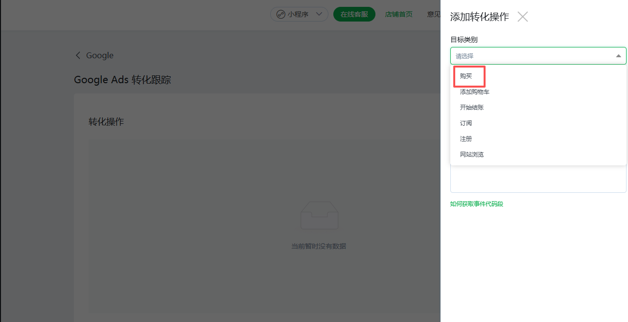 (39)选择需要添加的目标类型,如上述步骤复制的是网页浏览的事件代码,就选择“购买”