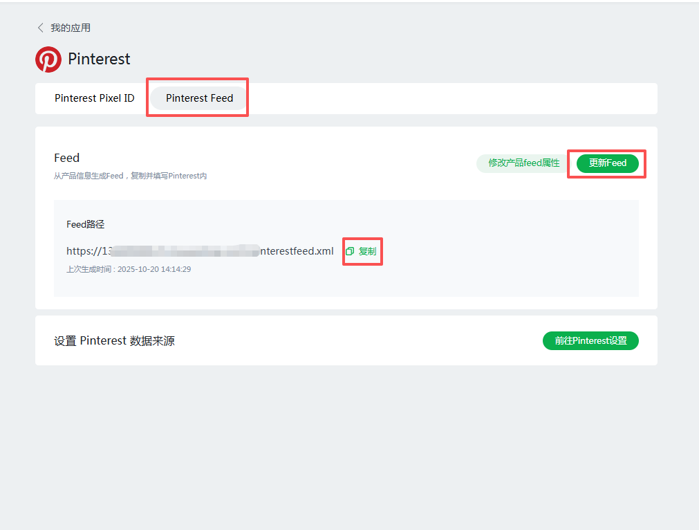 (4)点击pinterest,点击更新feed后,复制XML链接
