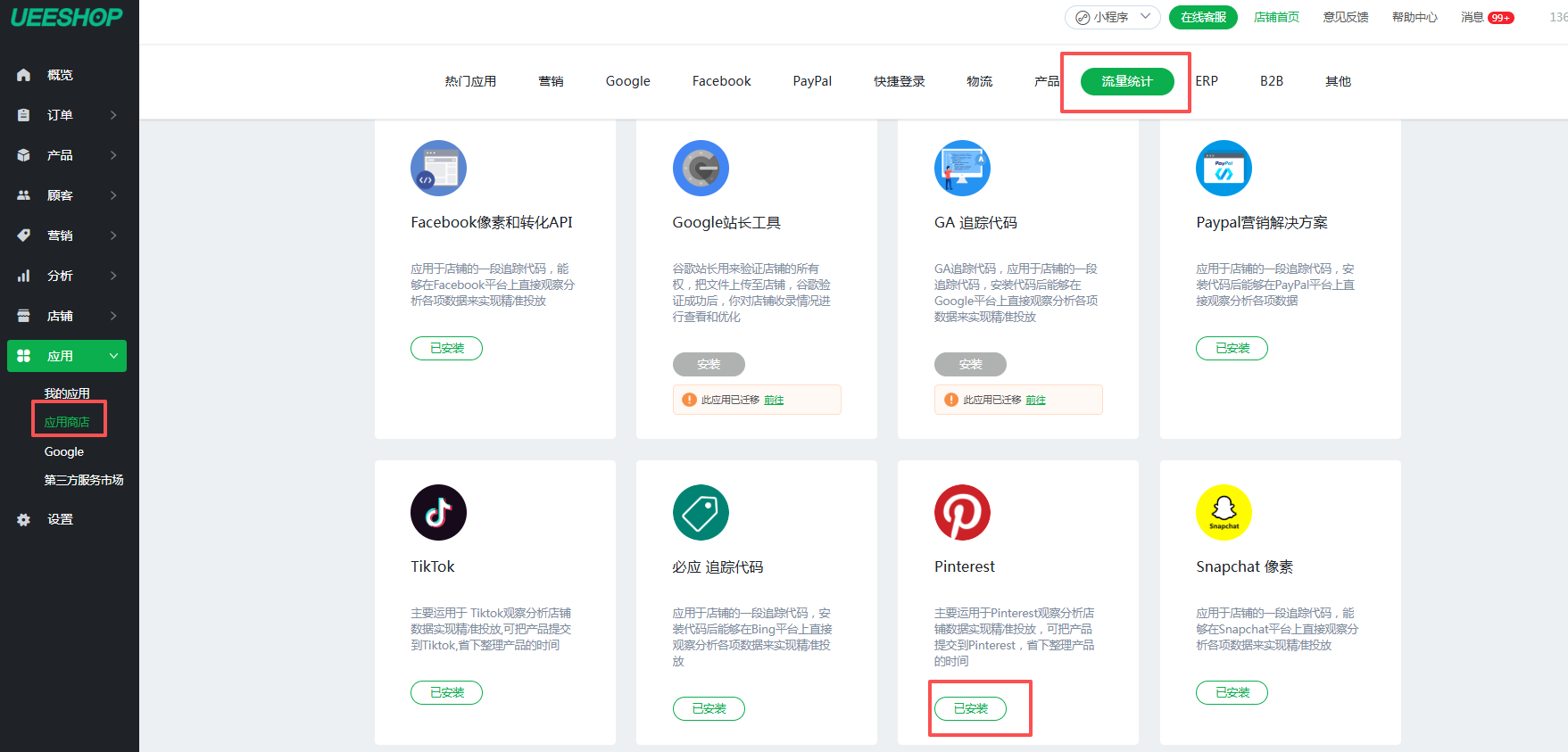 (3)登录网站后台,左侧工具栏点击应用--应用商店,找到pinterest,进行安装