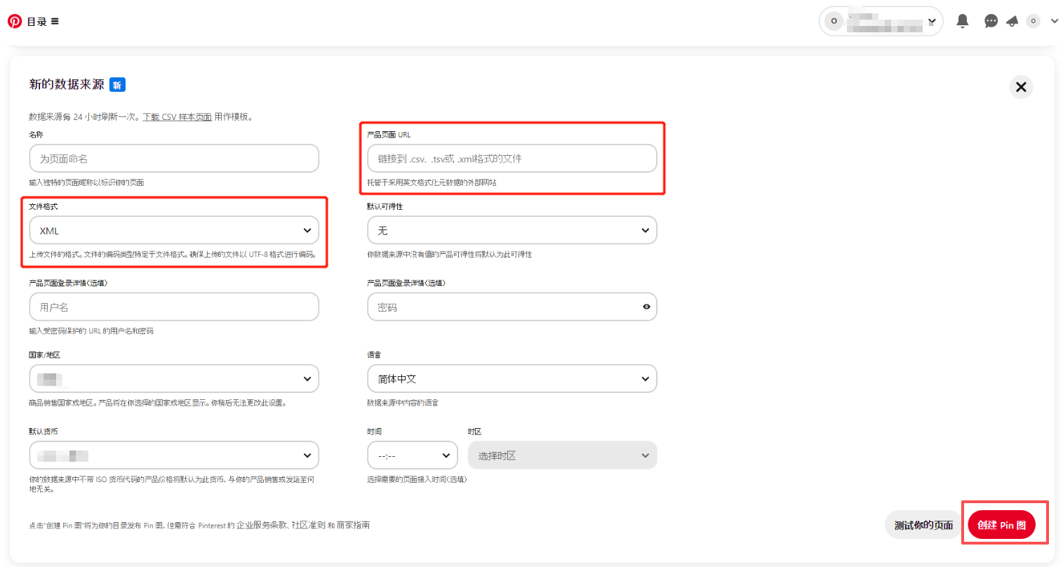 (5) 回到pinterest,填写 Feed 上传规则。将文件格式调整为“XML”,从复制的 XML 链接,填入产品页面URL