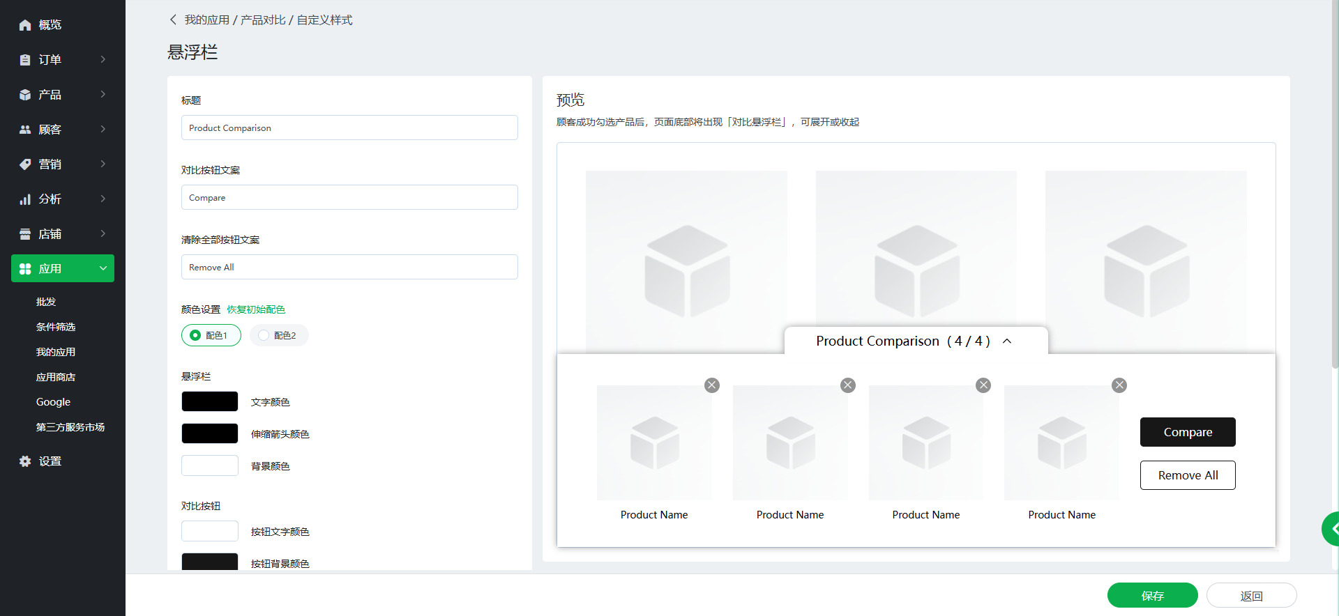 · 自定义样式的悬浮栏点击【设置】按钮,将进入样式配置页面。该页面分为配置面板与实时预览区,用户可在此自定义按钮文案、颜色等,所有修改需保存后生效