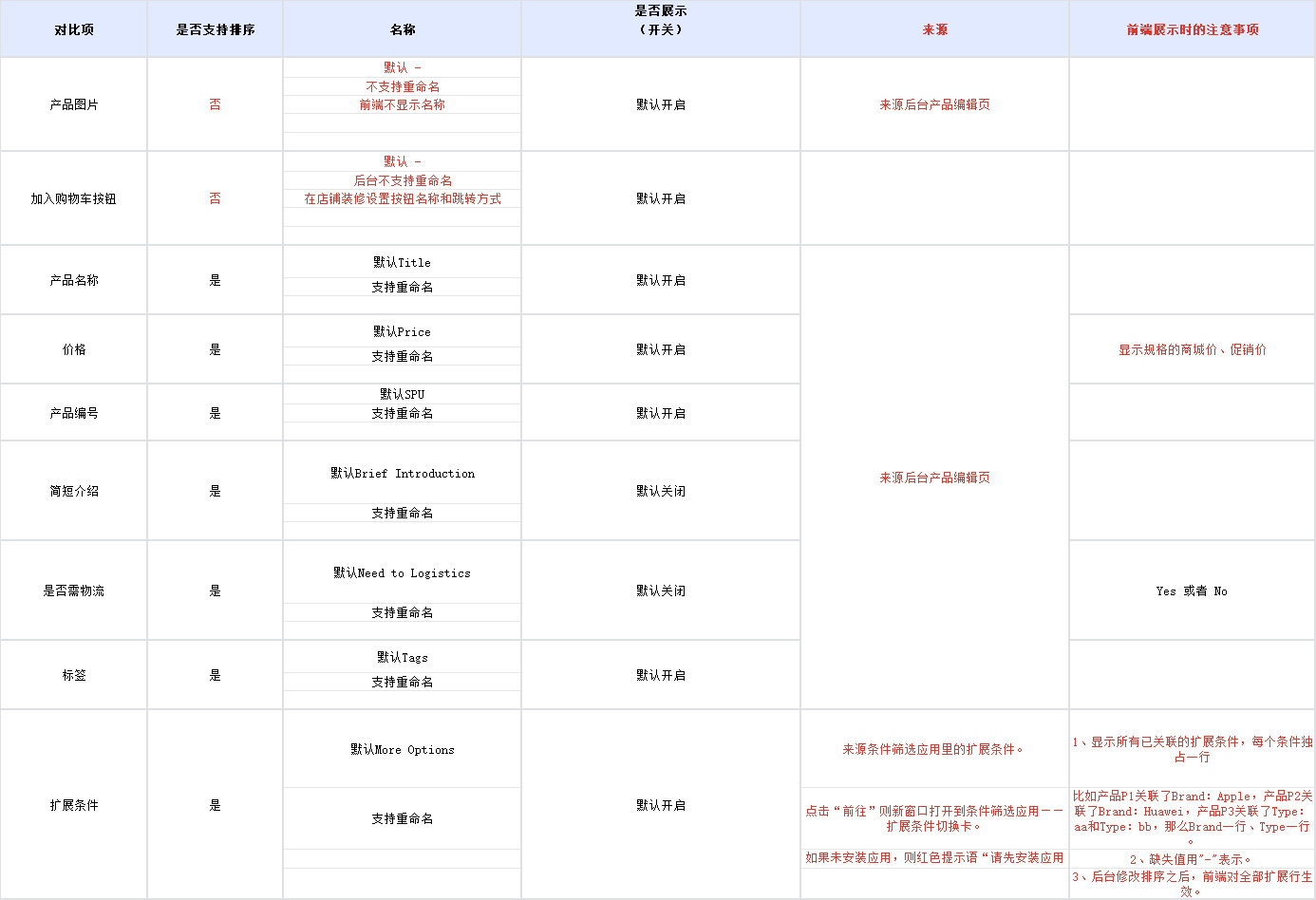 产品对比项包括:产品图片 、加入购物车按钮 、产品名称 、价格 、产品编号、简短介绍、是否需物流、标签、扩展条件。