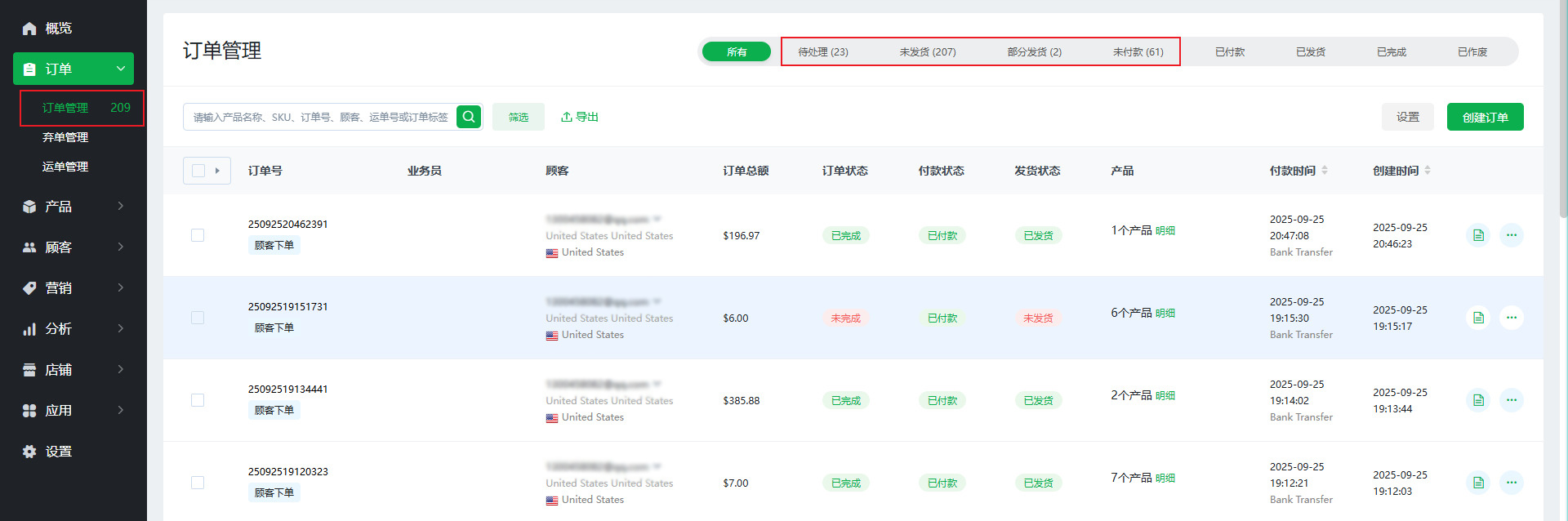 · 在【订单管理】列表页中,“待处理、未发货、部分发货、未付款”切换卡实时显示对应订单数量(数量为0时不显示)