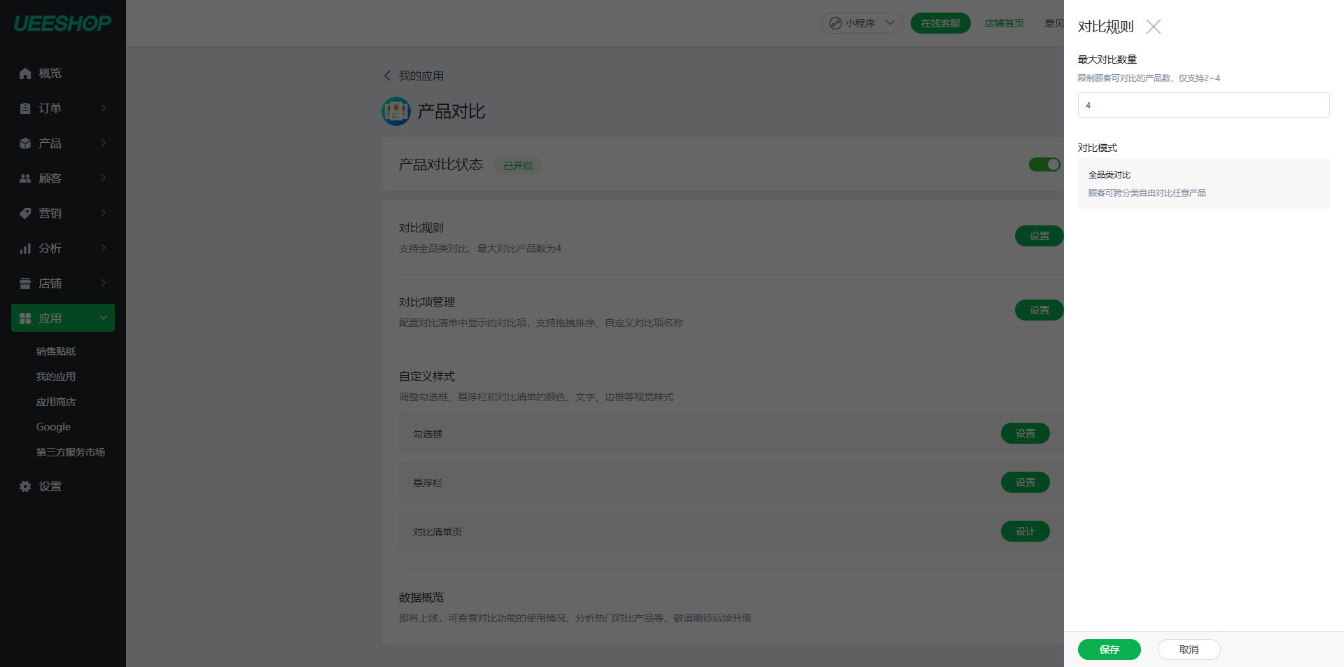 · 对比规则点击【设置】按钮,可在弹窗中配置产品对比规则,限制顾客可对比的产品数量。可选范围为2至4个,默认值为4个。