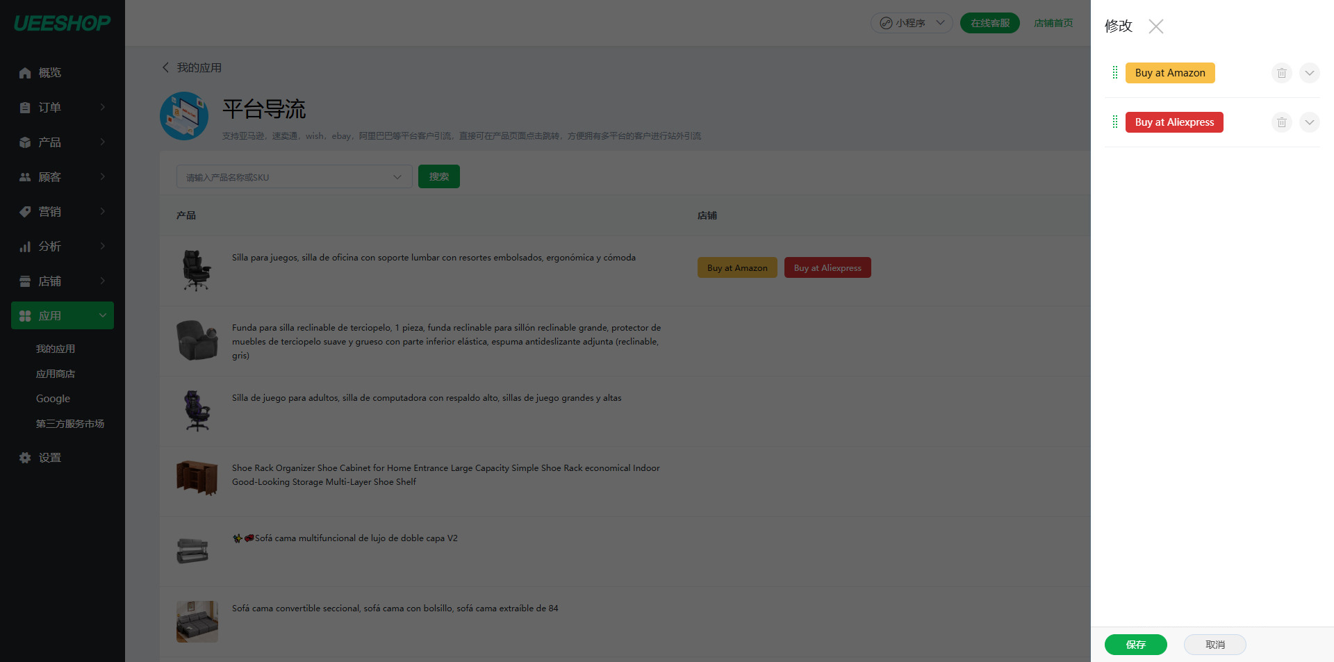 功能概述:平台导流应用新增导流按钮排序功能,卖家可在产品管理界面,通过拖拽调整不同平台的展示顺序。