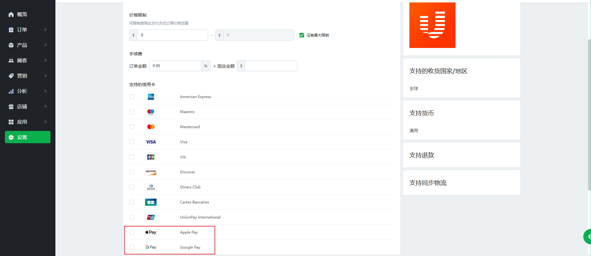 后台Useepay信用卡编辑页,支持的信用卡增加Apple Pay、Google Pay: