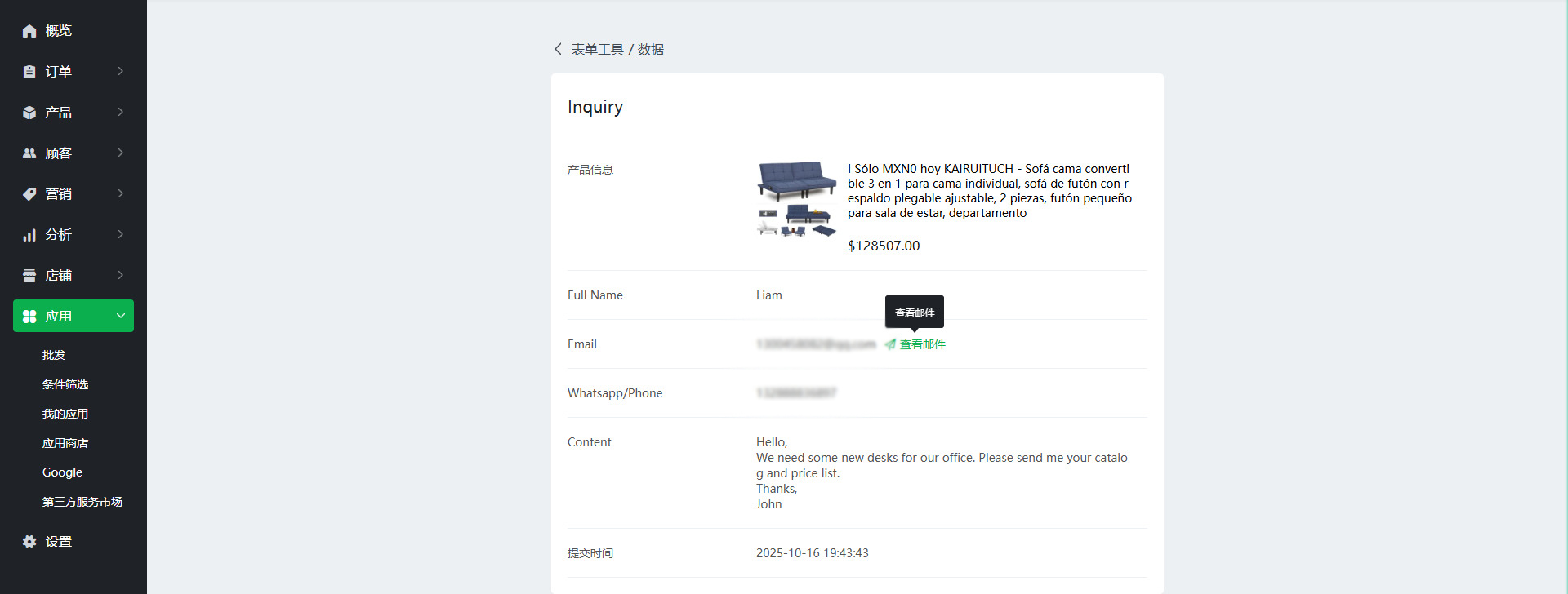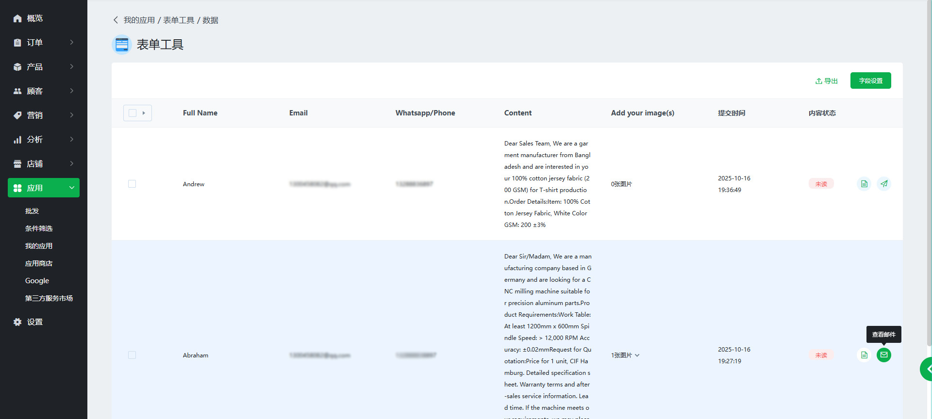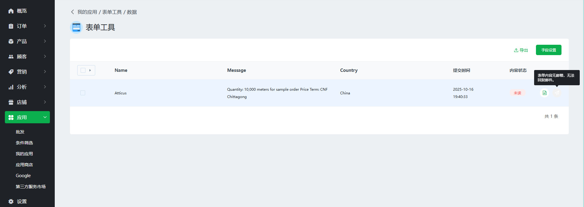 功能概述:表单工具新增“邮件回复”功能,卖家可直接在后台对收到的表单信息进行邮件回复与查看。