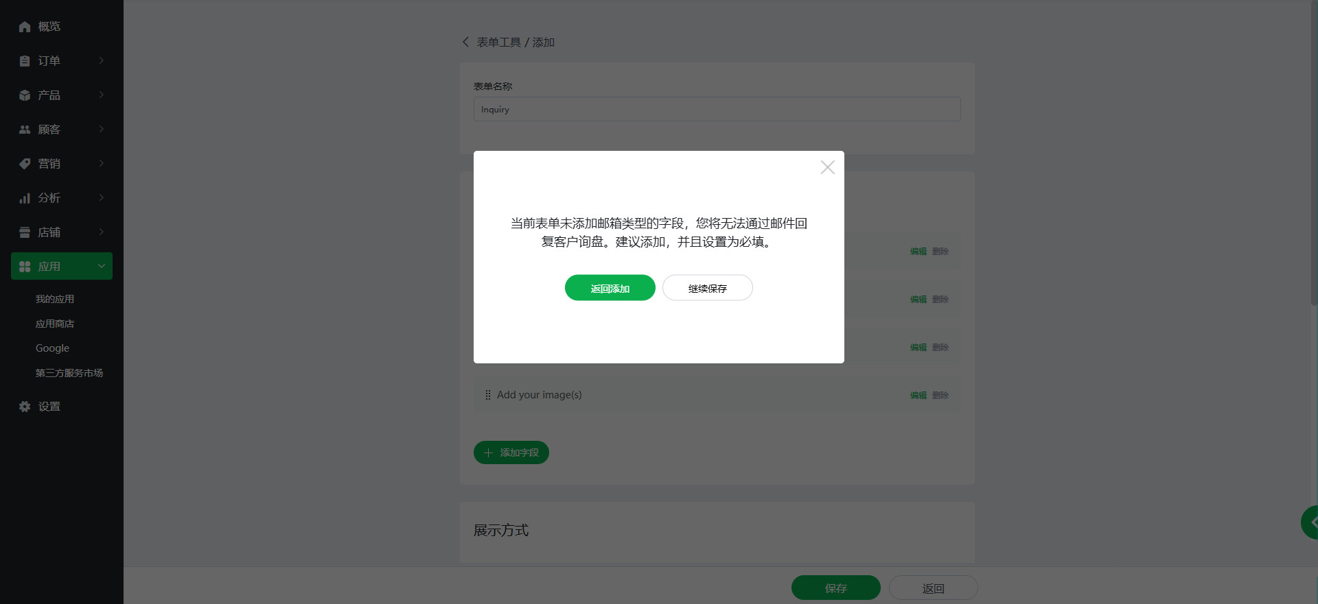 (1)在后台表单工具(适用于询盘、联系我们及自定义页面)中保存表单时,如未设置任何邮箱类型字段,系统将弹出提示:“当前表单未添加邮箱类型字段,您将无法通过邮件回复客户询盘。建议添加并设置为必填项。”