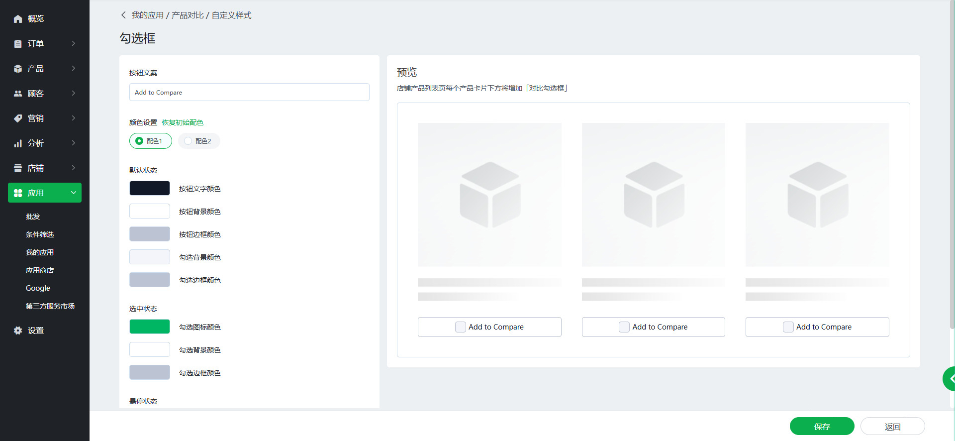 · 自定义样式的勾选框点击【设置】按钮,将进入样式配置页面。该页面分为配置面板与实时预览区,用户可在此自定义按钮文案、颜色等,所有修改需保存后生效。
