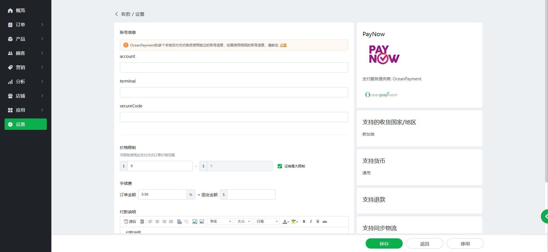 功能概述:钱海(Ocean Payment)支付服务,新增多种东南亚本地支付方式,包括PayNow、DuitNow、TouchnGo、Online Banking等