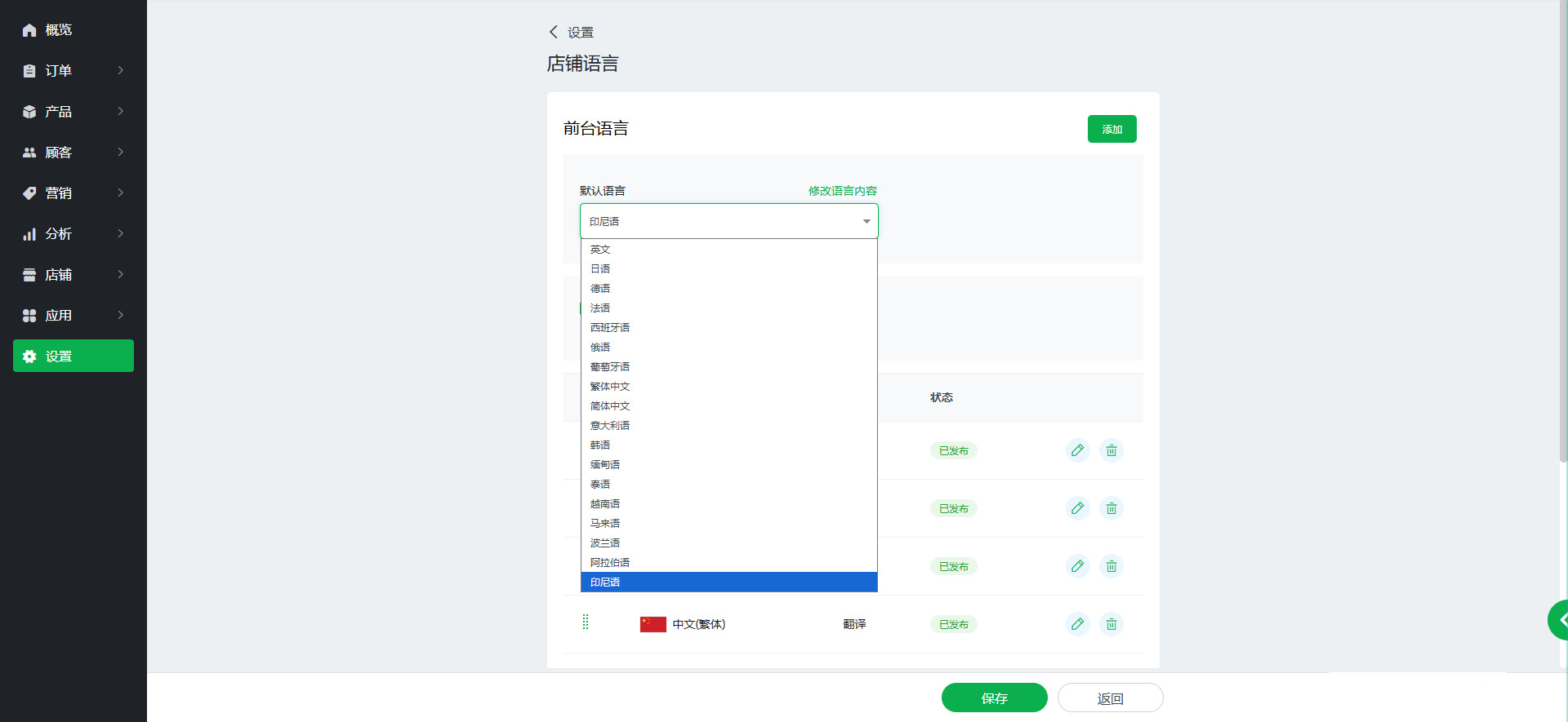 功能概述:新增印尼语语言框架,卖家可将印尼语设置为自定义或默认语言,并在系统内完成内容翻译、语言包修改及AI助手交互等操作。