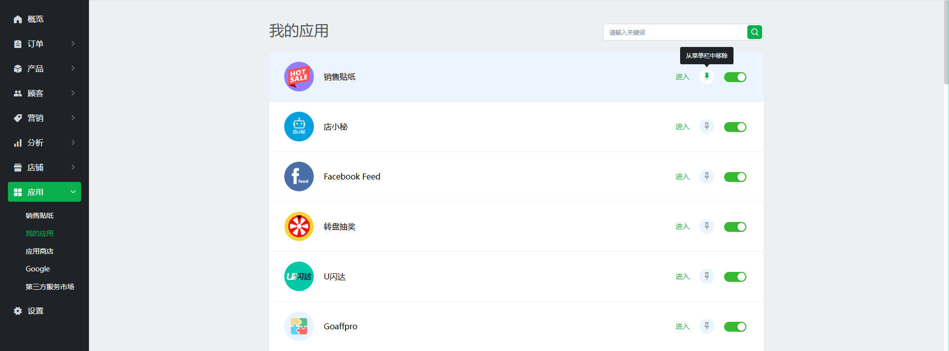 (2)后台我的应用页面,每个应用增加【固定到菜单栏】和【从菜单栏移除】操作: