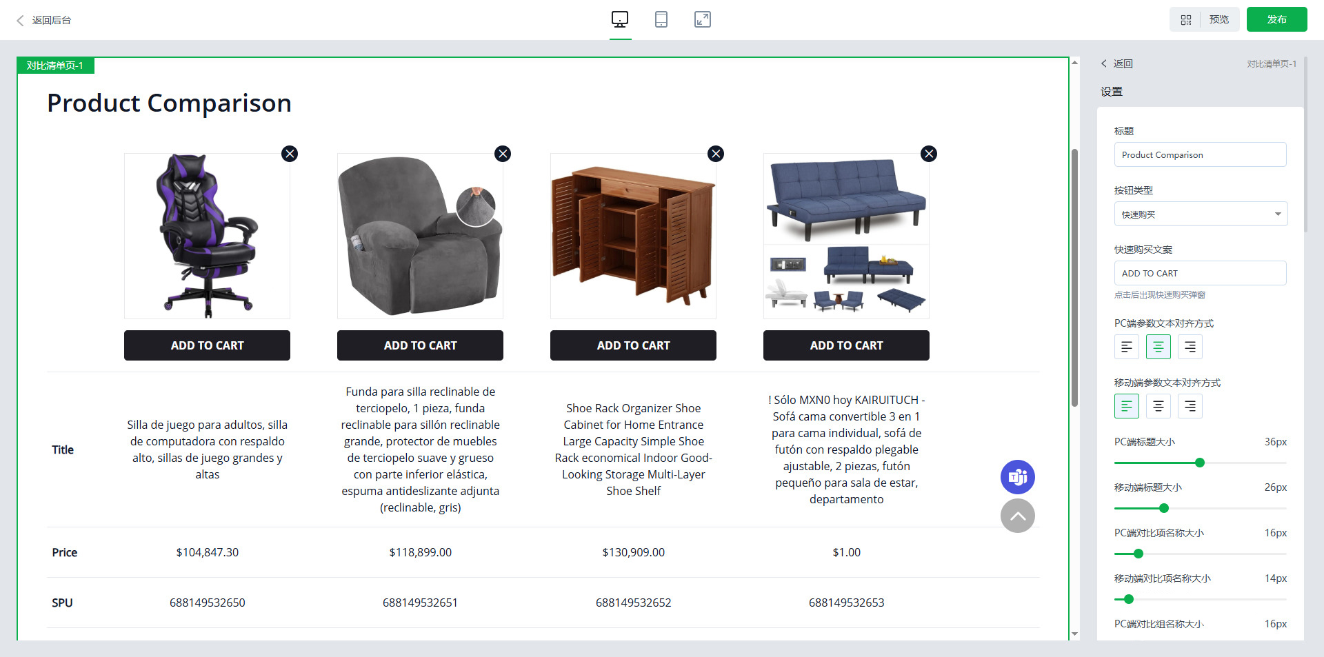 【3】增强装修灵活性:后台支持自定义对比项、按钮样式和布局,满足不同品牌的设计和营销需求。