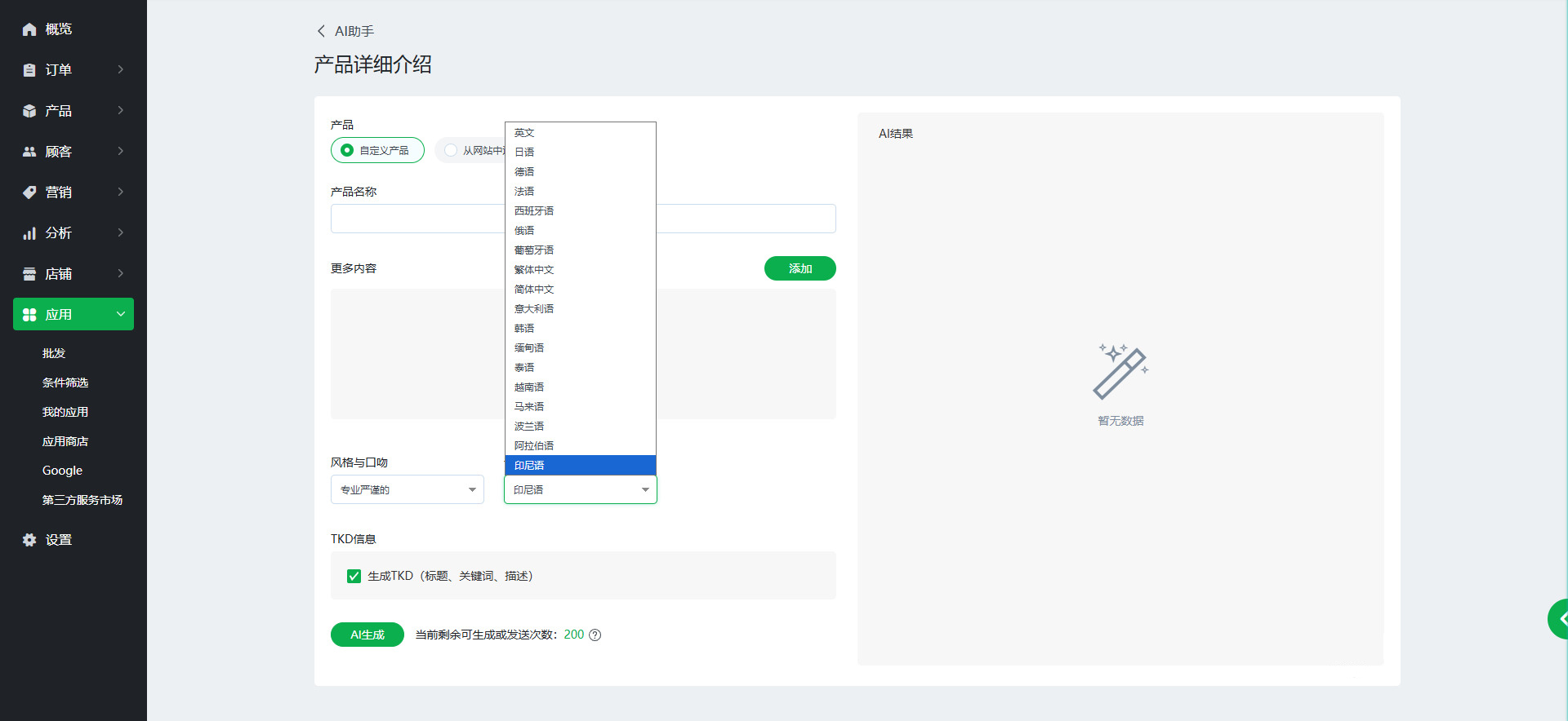 • 如果设置了印尼语为自定义语言,那么语言的下拉菜单需显示印尼语,推送给AI的指令也需要求AI用印尼语输出内容。