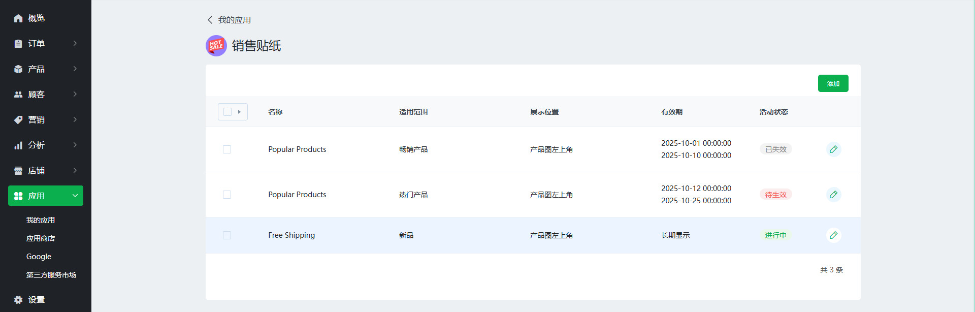 功能概述:销售贴纸应用新增有效期设置与自动状态管理功能,支持为销售贴纸设置生效与结束时间,同时,系统将自动切换“待生效/进行中/已失效”状态。