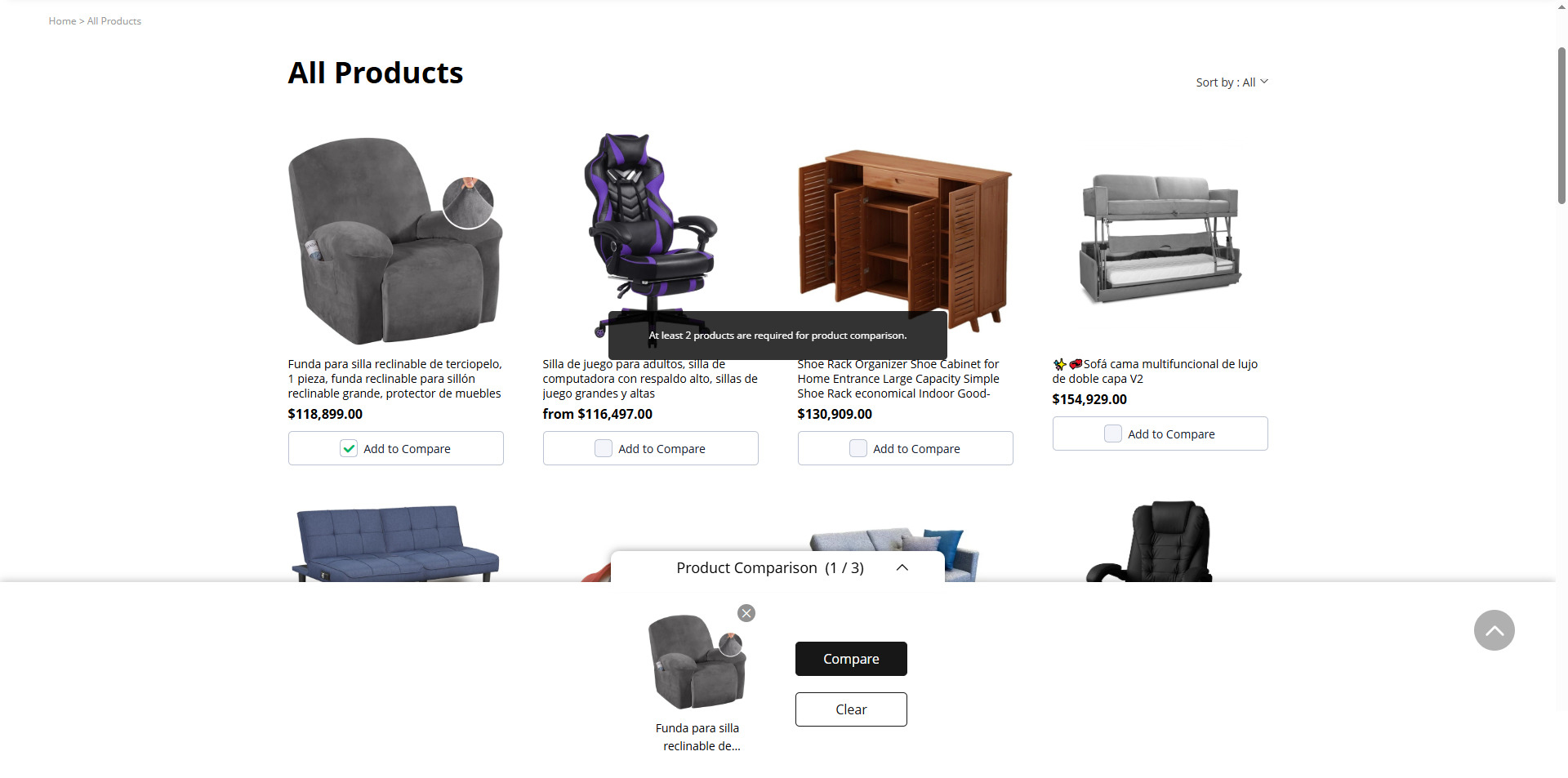 · 对比操作验证:点击“开始对比”按钮(Compare)时,若产品数量未达到2个,则显示提示“至少需选择2个产品才能对比。”并中止操作;数量达标则正常跳转至对比页。