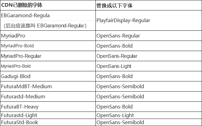 以下字体已从CDN中删除,需同步从网站端移除(含编辑器、店铺装修等场景),并替换为指定字体: