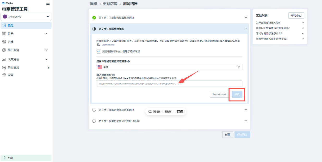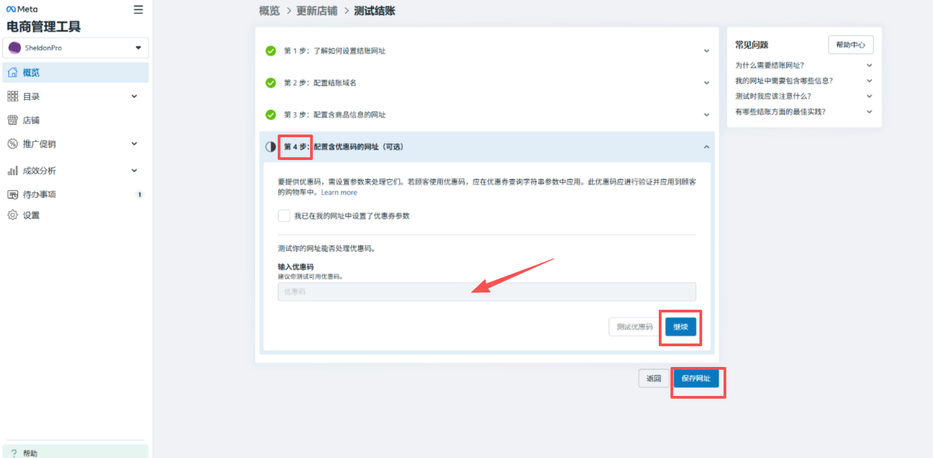 (7)进入第四步,如独立站有创建可用优惠券可设置到优惠券码输入框中,跳转网站结算时会自动带入,如果没有,可以点击继续,并且保存地址