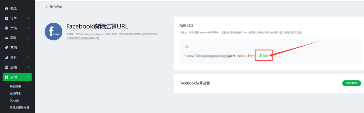 (3)登录到网站后台,左侧工具栏,点击应用--应用商店,找到facebook购物结算URL