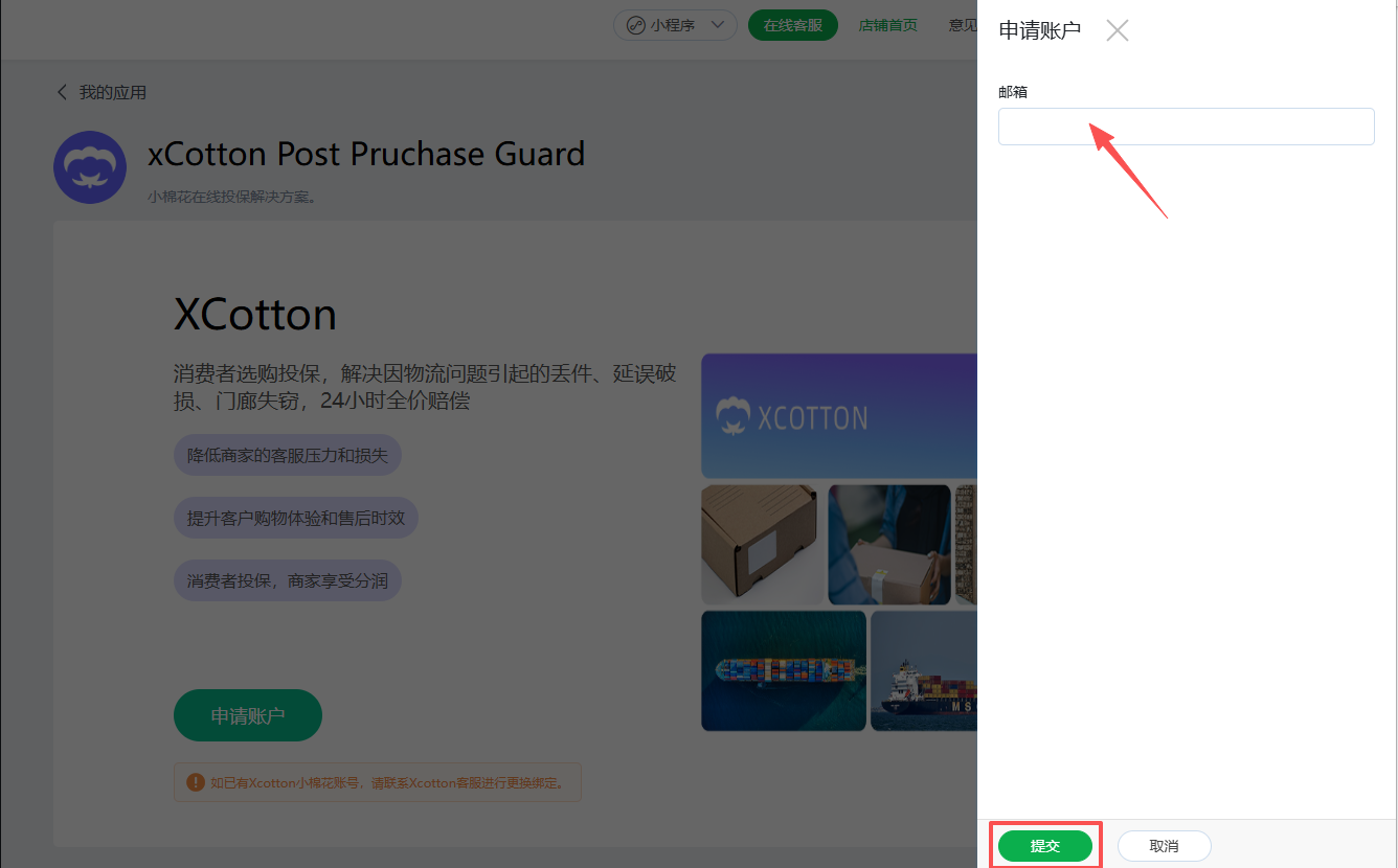 3.填写联系邮箱,并提交,信息提交后,等待Xcotton 联系开通;或联系邮箱:dorapan@xcotton.cn 手机:18520189368(微信同号)